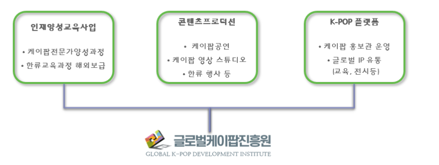 글로벌케이팝진흥원은 스타들과 팬들이 함께 즐기며 콘텐츠를 만들면서 서로간의 문화를 공유하고 소통하는 하나의 문화 시그니처로 역할을 하게 될 것입니다. K-POP을 통해 스타와 팬을 둘러싼 다양한 현상을 계속 연구하고 탐구해서 체계화하고, 이를 다른 형태의 문화로 적용해나가는 선순환 생태계를 만들어 가고자 합니다. 아시아로부터 시작해 전세계로 K-POP의 전문가와 홍보관을 확장해 나갈 계획입니다.
